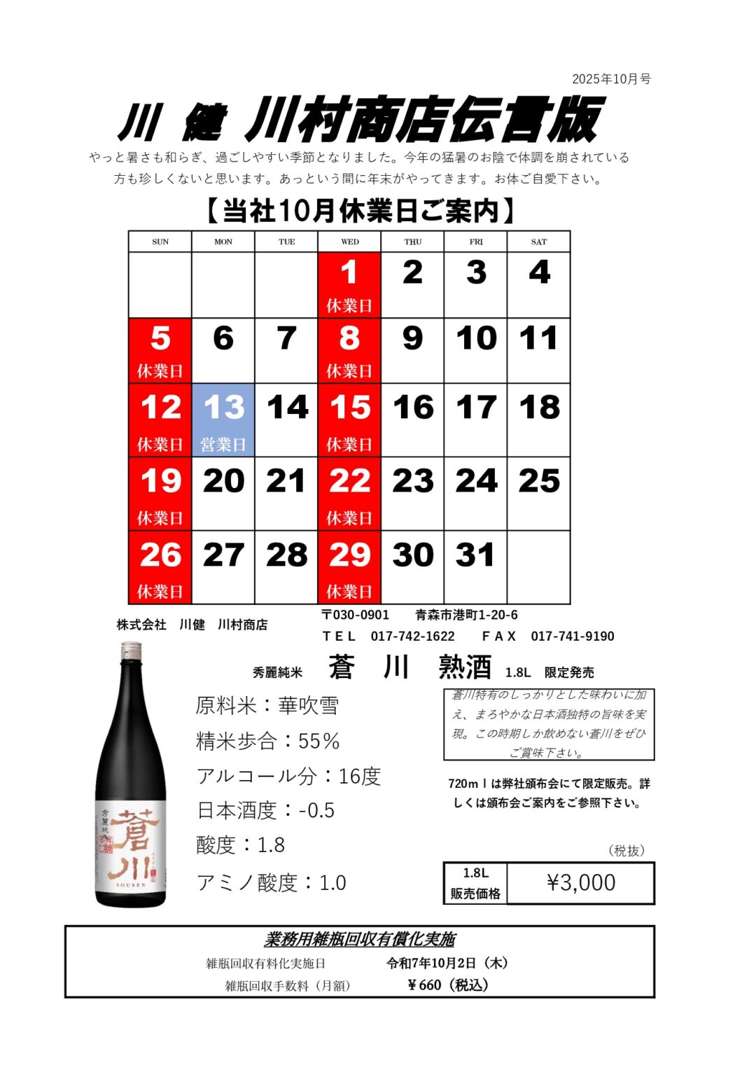 川村商店 2025年10月伝言板