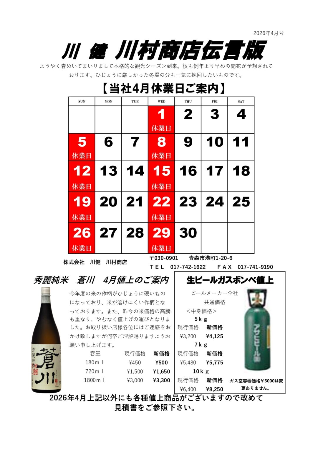 川村商店2026年4月伝言板